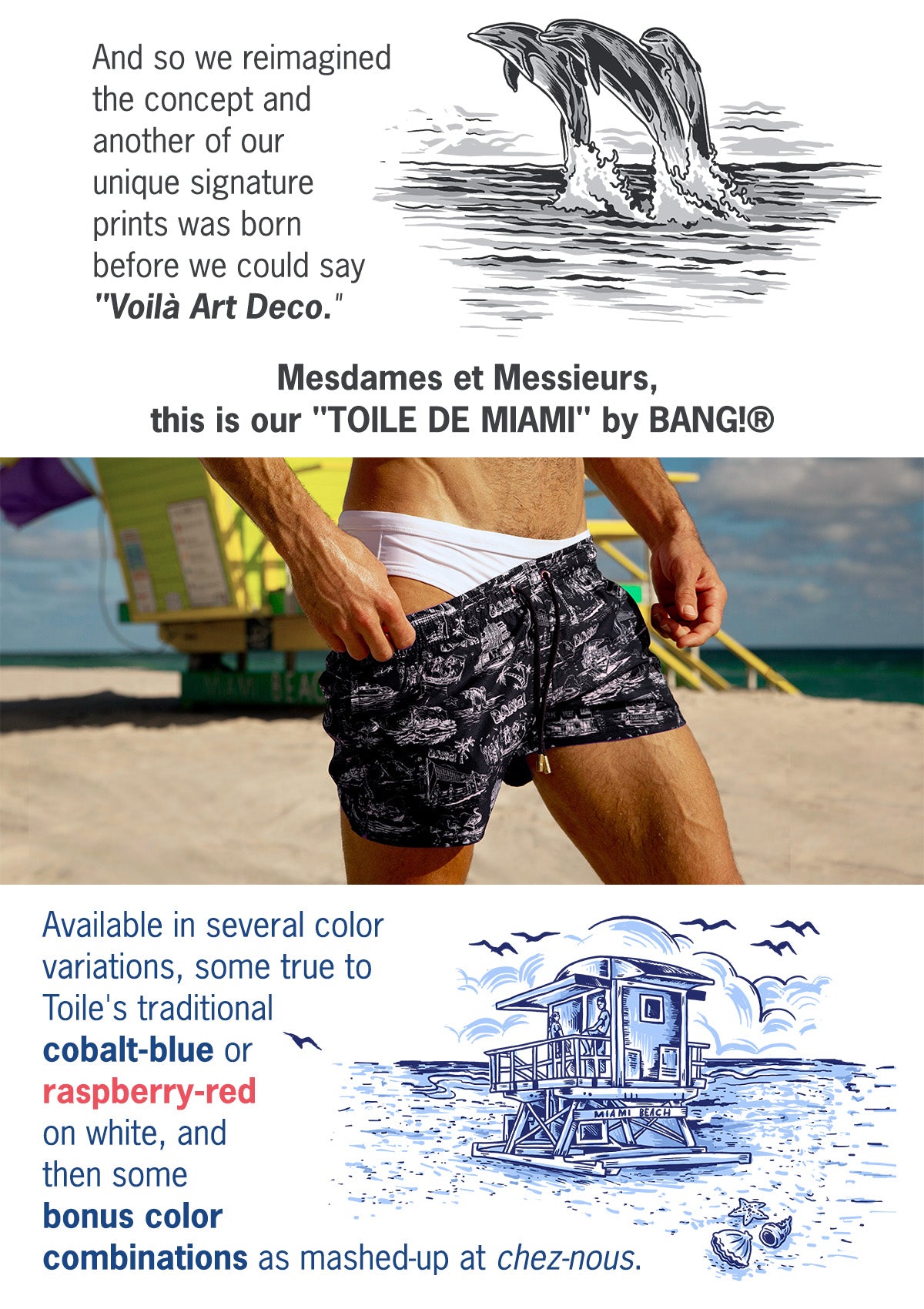 • BANG!® TOILE DE MIAMI (BLUE) Swim Brief — model wearing men’s swimsuit with blue toile-style Miami print.