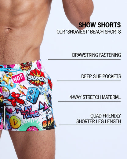 These are BANG!’s SHOWIEST beach shorts ever. Ready to show off! Show those legs. Show those quads. Show them all you got! We cut these beach trunks as short as we could. We even went 1” shorter than our Beach Shorts in the outer seam to take these beachwear bad boys to a new show-stopping level. Served just like vintage rugby or volleyball shorts, but with BANG!’s signature shape enhancing tweaks. Meet your new partner in crime to hit the beach or pool in a perfect fitting swimsuit ready to put on a show. Get ready for showtime in BANG! Show Shorts.