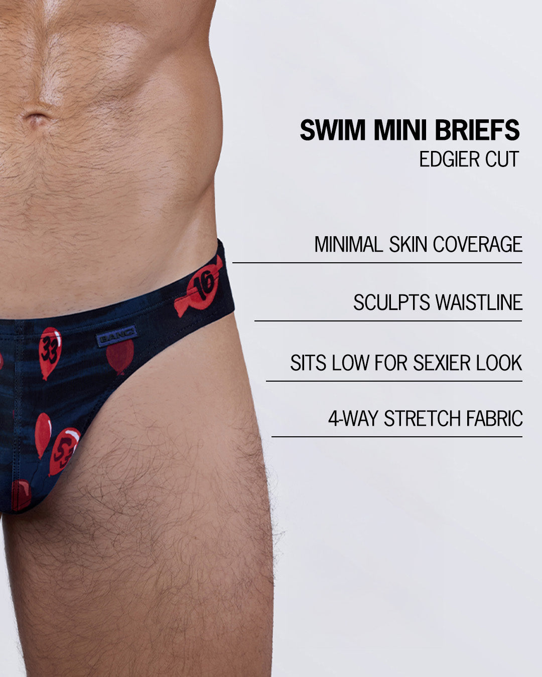 BANG!® Swim Mini-Briefs feature an edgier cut that shows more skin with a perfect fit. A 'minimal' coverage suit featuring a combo of low-waist cut, a high-leg opening, low-rise seat, and snug fit, to sculpt a man’s waistline to the extreme. A bikini-style bathing suit for men who dare or those who just feel 100% comfortable in their own skin.