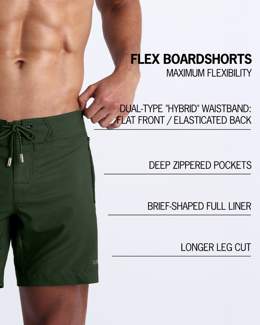 BANG! Flex Boardshorts offer maximum flexibility and responsiveness to adapt to any men's body form while maintaining great looks. Innovation in design: these men’s beach boardies are equipped with a dual-type hybrid waistband which blends a flat style segment at front with Hook-&-Loop closure, and an elasticated segment at rear. The technical combination of different waistband systems all in one enables this bathing suit to adapt comfortably to the widest range of variations in waist size and adjust to diverse men’s body shapes yet delivering a slick look with a perfect fit.