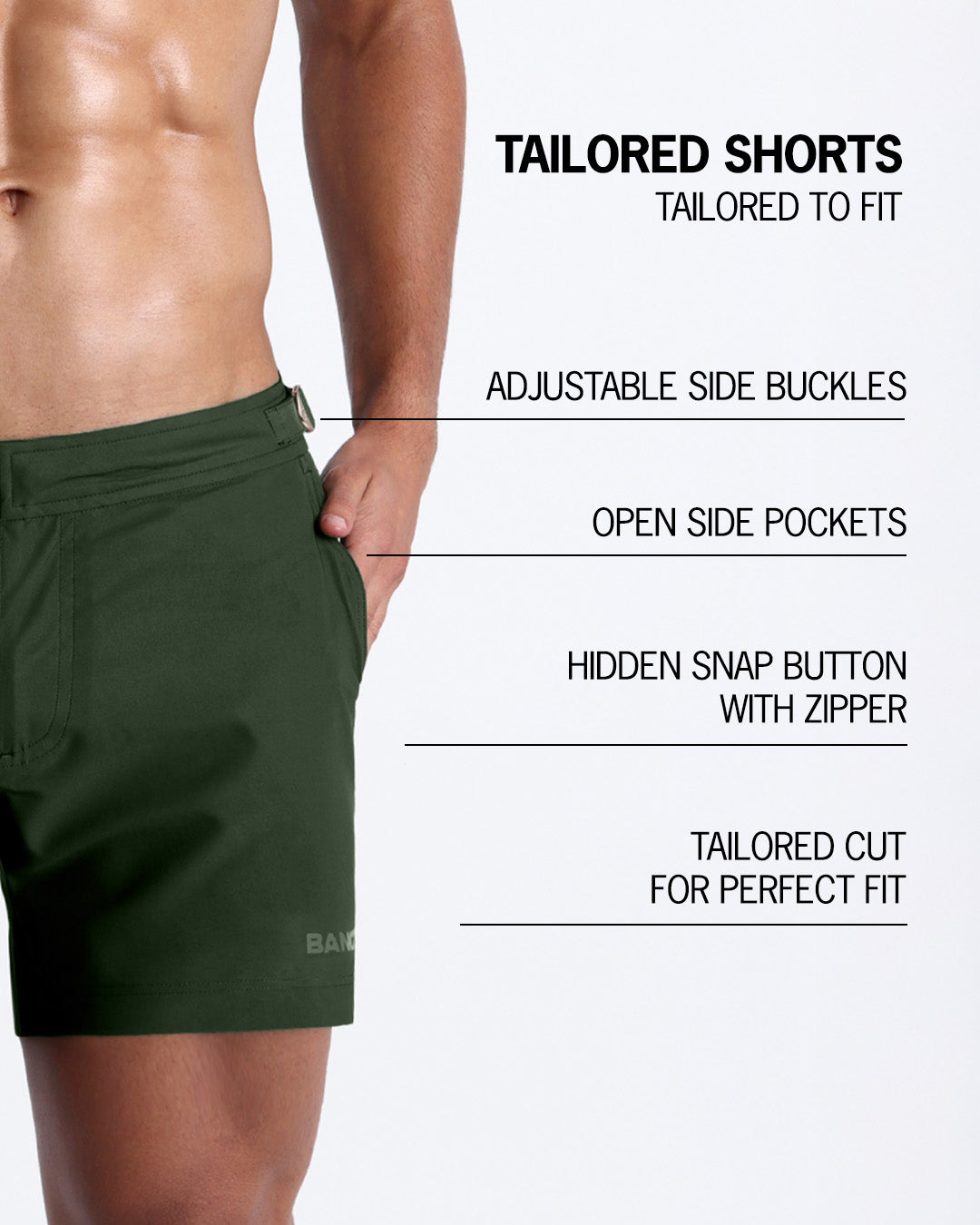 Design and form meet comfort and functionality in a men’s bathing suit. We remixed the construction of men’s classy tailored trousers and came up with these ready-to-wet guys. You can think of BANG! Tailored Shorts as funky dress shorts with swimming powers. These high-quality men swim trunks offer a carefully crafted tailored cut that delivers effortless style with a perfect fit.