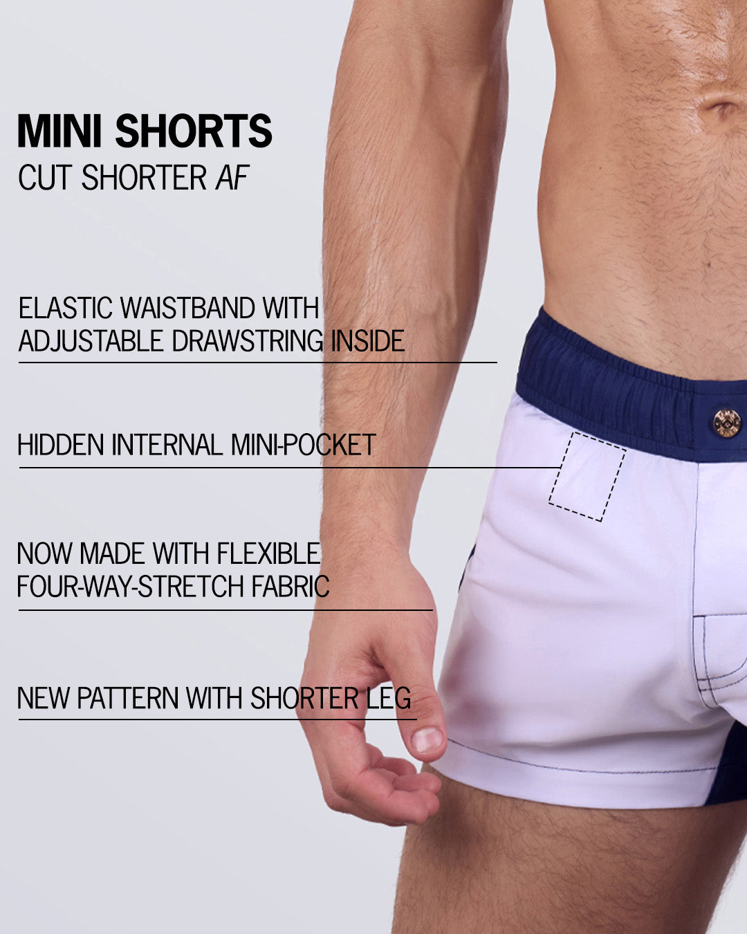The name says it all: BANG!® MINI SHORTS are cut shorter AF, so legs of all kinds can get all the applause. These bad boys are practically the “shorts-equivalent” of our acclaimed Swim Mini-Briefs, cut to a “minimal” edge. A slightly shorter leg length than in our Show Shorts, combined with the signature four-way-stretch top-grade fabric of all our Beach Shorts line, become a match-made-in-heaven for unbeatable poolside and beachside eye-magnet domination.