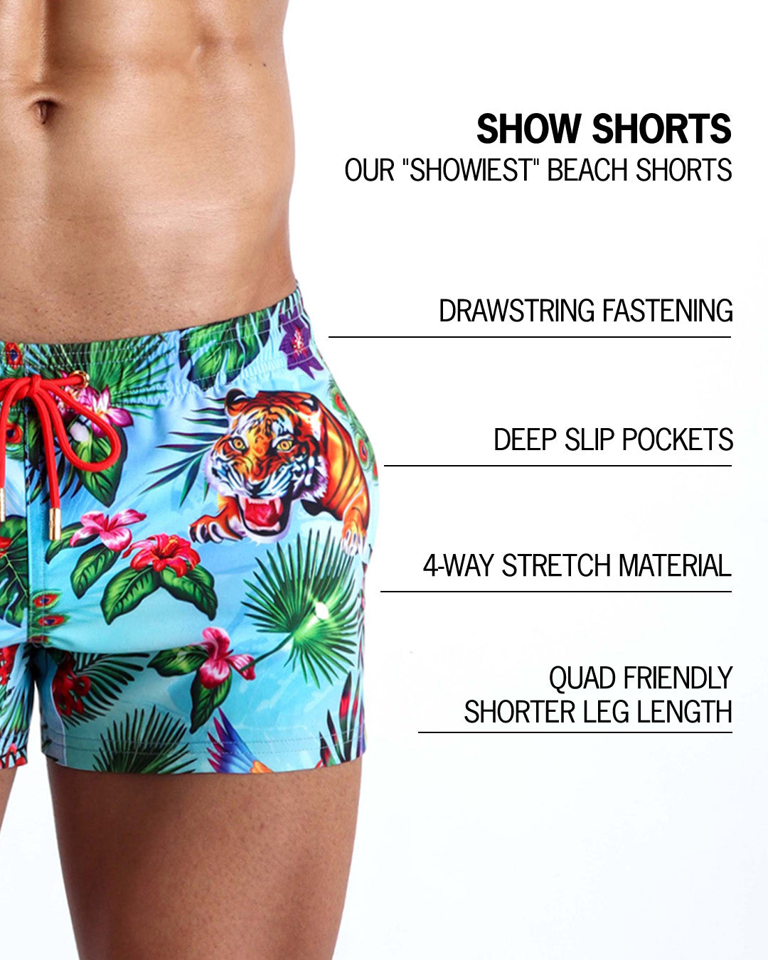 These are BANG!’s SHOWIEST beach shorts ever. Ready to show off! Show those legs. Show those quads. Show them all you got! We cut these beach trunks as short as we could. We even went 1” shorter than our Beach Shorts in the outer seam to take these beachwear bad boys to a new show-stopping level. Served just like vintage rugby or volleyball shorts, but with BANG!’s signature shape enhancing tweaks. Meet your new partner in crime to hit the beach or pool in a perfect fitting swimsuit ready to put on a show. Get ready for showtime in BANG! Show Shorts.