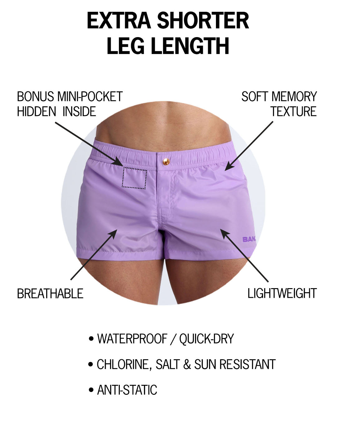 The name says it all: BANG!® MINI SHORTS are cut shorter AF, so legs of all kinds can get all the applause. These bad boys are practically the “shorts-equivalent” of our acclaimed Swim Mini-Briefs, cut to a “minimal” edge. A slightly shorter leg length than in our Show Shorts, combined with the signature four-way-stretch top-grade fabric of all our Beach Shorts line, become a match-made-in-heaven for unbeatable poolside and beachside eye-magnet domination.