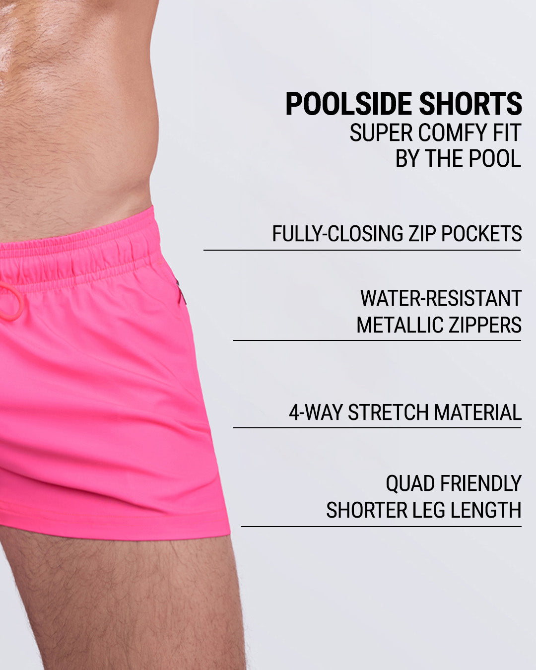 These new kids on the block are the direct cousins of our signature Show Shorts by BANG!® but with some bonus details that make them ideal for poolside leisure. Cut with the same shorter-leg length, so that your quads look their best.