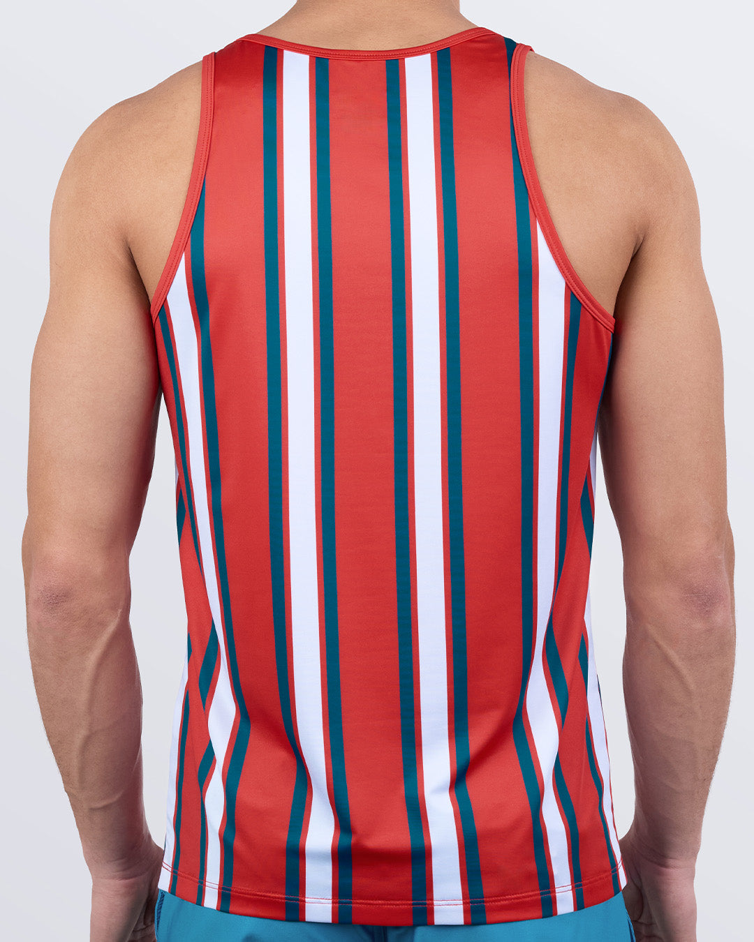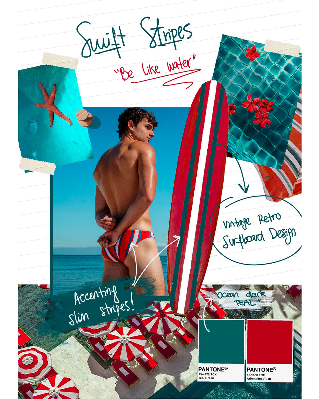 Borrowing inspiration from vintage mid-60s surfboard design. We came up with a color block of red panels, intertwined with high-contrasting whites, and accenting slim stripes in ocean dark teal green. It takes an artful of swift moves to glide above waves. Always in motion. Be like water. Become one with the waves. Embrace your swift inner self.