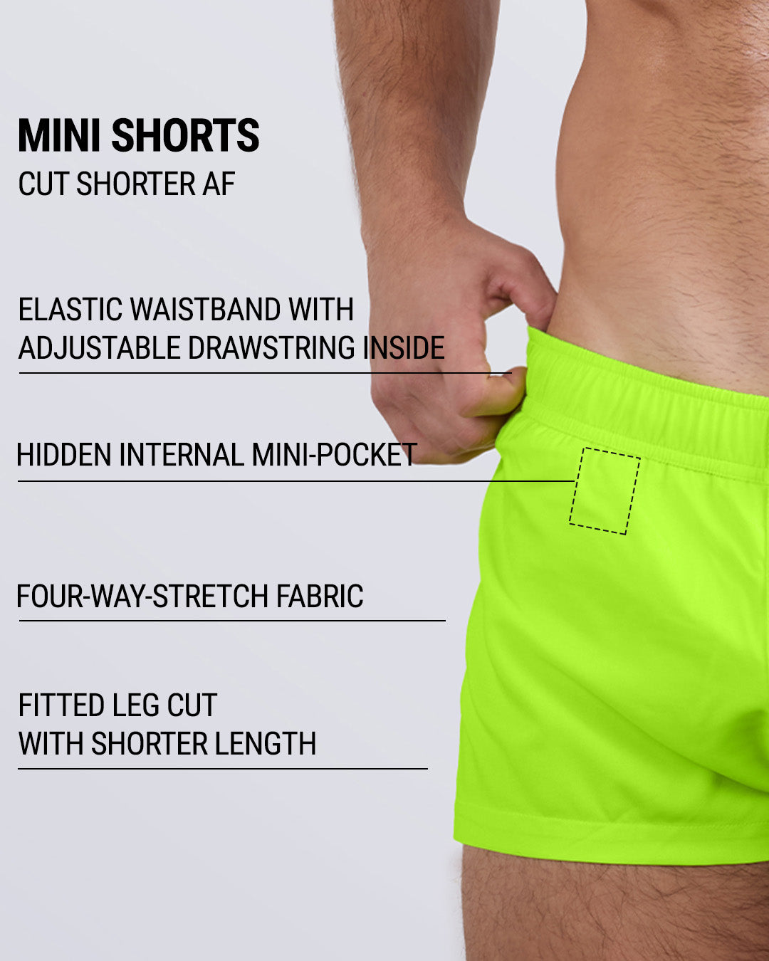 The name says it all: DC2® MINI SHORTS are cut shorter AF, so legs of all kinds can get all the applause. These bad boys are practically the “shorts-equivalent” of our acclaimed Swim Mini-Briefs, cut to a “minimal” edge. A slightly shorter leg length than in our Show Shorts, combined with the signature four-way-stretch top-grade fabric of all our Beach Shorts line, become a match-made-in-heaven for unbeatable poolside and beachside eye-magnet domination.