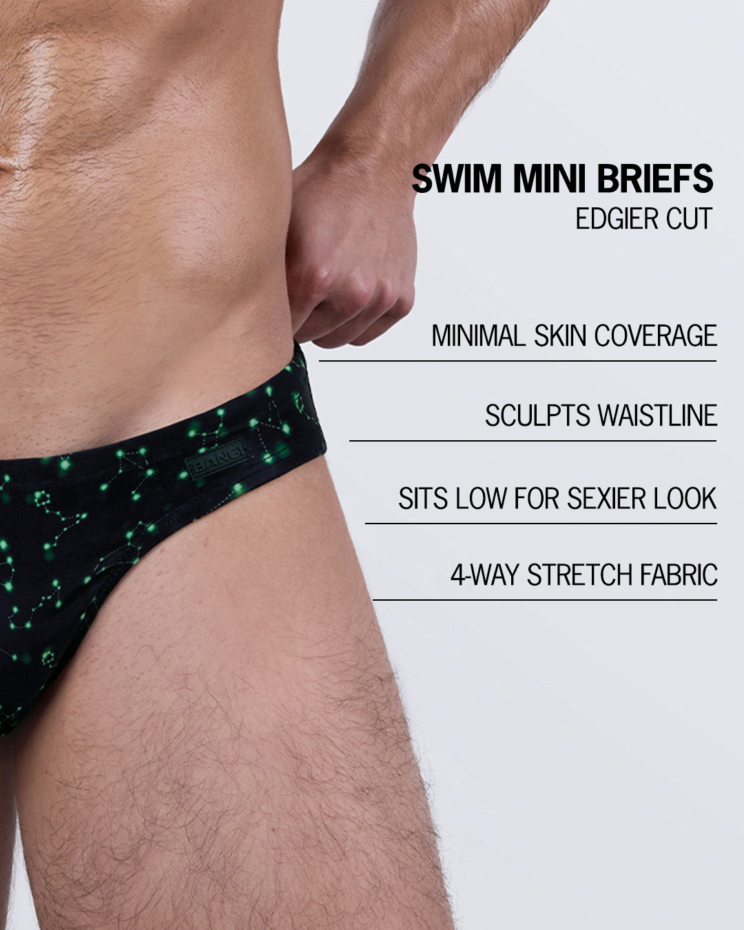 BANG!® Swim Mini-Briefs feature an edgier cut that shows more skin with a perfect fit. A 'minimal' coverage suit featuring a combo of low-waist cut, a high-leg opening, low-rise seat, and snug fit, to sculpt a man’s waistline to the extreme. A bikini-style bathing suit for men who dare or those who just feel 100% comfortable in their own skin.